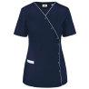 65% polyester / 35% coton. Tissu twill polycoton. Lavage à 60°C. Coupe ajustée grâce à des pinces devant et dos pour une coupe plus féminine. Encolure en V, Fermeture asymétrique par bouton-pression. 2 poches avant dont une (à droite) à double compartiments (poche intérieure à bord contrasté). Passepoil contrasté à l'encolure et le long de la patte de fermeture. Etiquette nom à l'intérieur du vêtement. Etiquette de marque Tear Away.