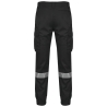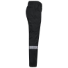 65% polyester / 35% coton. Tissu sergé. Lavage 60°C. Coupe straight. 2 poches devant. 2 poches à soufflet côtés à rabat avec fermeture par boutons pression. 1 poche passepoilée arrière fermée par un zip. Découpes de renfort aux genoux en tissu principal ton sur ton. Ceinture élastiquée côtés avec passants renforcés dont passant milieu dos plus haut (8cm). Fermeture zippée et boutonnée avec bouton plastique. Bas de jambes élastiqué. La bande rétroréfléchissante est certifiée par la norme EN17353:2020 jusqu'à 30 cycles de nettoyage à 60°C. Triple piqûres à l'entrejambe, côtés et fourche devant et dos pour plus de résistance. Etiquette de marque détachable.