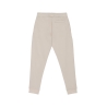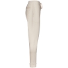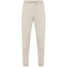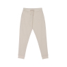 85% coton biologique / 15% polyester recyclé post-consumer. Coton peigné ringspun. Lavé aux enzymes. Molleton gratté 3 fils LSF (Low Shrinkage Fleece). Ceinture en côte 1 x 1 avec cordon de serrage et oeillet boutonnière. Poches latérales et une poche arrière passepoilée. Bord côte 1 x 1 bas de jambes. La couleur Raw Natural se distingue par son aspect brut visuellement texturé, parsemée de fines particules visibles à l’œil nu.