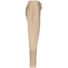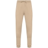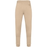 85% coton biologique / 15% polyester recyclé post-consumer. Coton peigné ringspun. Lavé aux enzymes. Molleton gratté 3 fils LSF (Low Shrinkage Fleece). Ceinture en côte 1 x 1 avec cordon de serrage et oeillet boutonnière. Poches latérales et une poche arrière passepoilée. Bord côte 1 x 1 bas de jambes. La couleur Raw Natural se distingue par son aspect brut visuellement texturé, parsemée de fines particules visibles à l’œil nu.