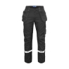 Pantalon de travail avec poches latérales italienne - Fermeture éclair YKK Natulon - poches arrière extra larges, poche avant côté gauche avec rabat et fermeture aimantée, poche interne pour téléphone et support pour carte d'identité. Poche sur le côté droit pour mètre pliant avec renfort Cordura et poche pour outils avec bouton pour couteau. Poche flottantes des deux côtés pour outils. Genoux préformés, tissu stretch à l'entrejambe. Taille élastique - Poches genouillères, ouverture extérieure avec fermeture éclair. Passant de ceinture plus large à l'arrière pour éviter la pression de la ceinture. Bouton caché à l'avant. Renfort Cordura® dans les poches arrière et sur les genoux pour une durabilité accrue. Poche à puce de lavage à la taille. Testé pour le lavage industriel selon la norme ISO 15797. Visibilité améliorée selon EN 17353 Certifié Oeko-Tex 100 Fourni dans un sac biosourcé et compostable