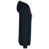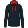 80% coton / 20% polyester. Coton peigné. Molleton gratté. Passe-fil écouteurs dans la poche kangourou et encolure. Finitions bord-côte aux poignets et bas du vêtement. Capuche doublée et contrastée avec cordon de serrage.