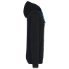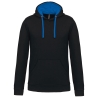 80% coton / 20% polyester. Coton peigné. Molleton gratté. Passe-fil écouteurs dans la poche kangourou et encolure. Finitions bord-côte aux poignets et bas du vêtement. Capuche doublée et contrastée avec cordon de serrage.