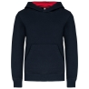 80% coton / 20% polyester. Coton peigné. Molleton gratté. Poche kangourou avec ouverture discrète et attache à l'intérieur du col pour passage écouteurs. Finition bord-côte aux poignets et bas de vêtement. Capuche doublée et contrastée.