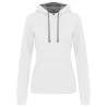 80% coton / 20% polyester. Coton peigné. Molleton gratté. Passe-fil écouteurs dans la poche kangourou et encolure. Bord-côte bas de manches et de vêtement. Capuche doublée et contrastée avec cordon de serrage.