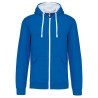 80% coton / 20% polyester. Coton peigné. Molleton gratté. Passe fil écouteurs dans la poche kangourou et encolure. Bord-côte bas de manches et de vêtement. Capuche doublée et contrastée avec cordon de serrage. Zip contrasté.