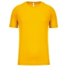 100% polyester. Tissu léger à séchage rapide. Encolure ronde avec bande de propreté. Manches raglan avec points de recouvrement. Finition double aiguille à l'encolure, bas de manches et de vêtement.